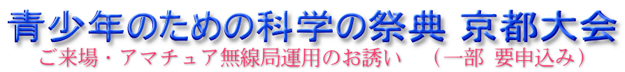 京都府支部では、『青少年のための科学の祭典』の趣旨に賛同し、毎年ブースを出展しています。今年は、例年の出展内容をさらにパワーアップし、特に初心者の運用サポートや無資格者の体験交信を充実させます。入場無料のイベントですので、多数ご来場ください。なお、有資格者で、運用を希望される方は、事前申込みをお願いします。 ※イベントの趣旨から、初心者の運用サポートの対象は、18歳以下に限定させていただきます。 |